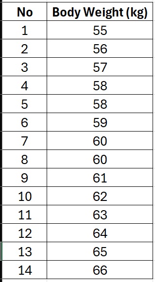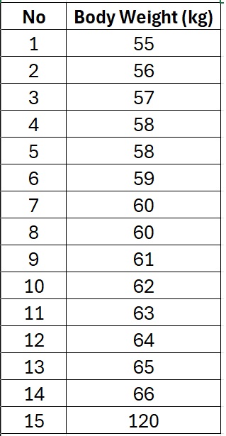 Imagine a researcher collects weight data from 15 participants. The data (in kilograms) is as follows: