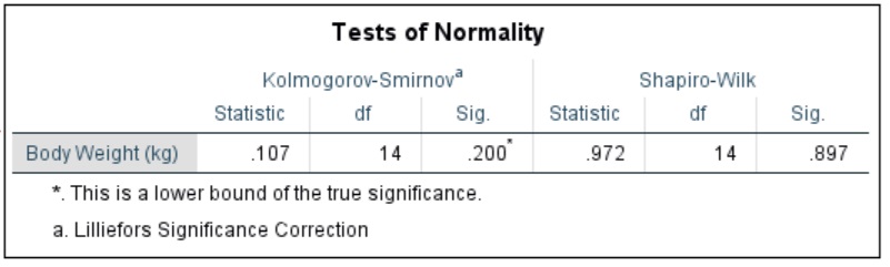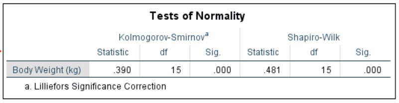 Most of the weights are between 55 and 66 kg, but one value stands out, 120 kg. This is clearly an outlier. The output of Shapiro-Wilk normality test using SPSS is as follows: