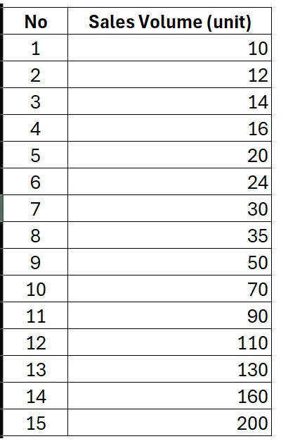 As the case study for this article, I will present an example dataset consisting of 15 branch stores located in region ABC. From these 15 stores, we recorded the monthly car sales volume. The detailed data for the monthly sales volume from these 15 stores is shown in the table below: