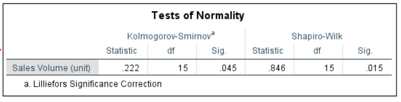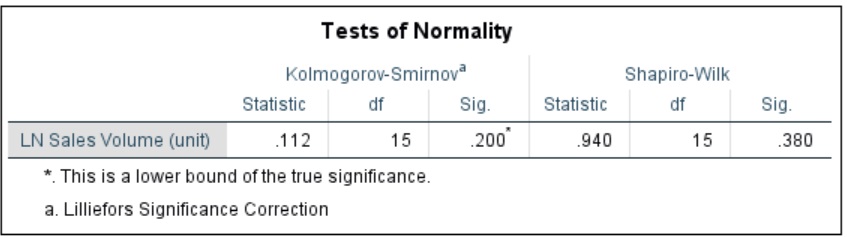 Once we have transformed the sales volume data into natural logarithm form, we re-run the normality tests using the same procedure described earlier with SPSS. The results from SPSS can be seen in the image below:
