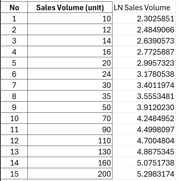 Among the various data transformation techniques used by researchers, the natural logarithm transformation is quite popular. To transform the sales volume variable into its natural logarithm form, we can easily do this using Excel. The method is simple: just type the formula =LN(…) and apply it to each sales volume data entry. You can then copy and paste the formula so that all sales volume data is converted into natural logarithm form. The transformed data can be seen in the table below: