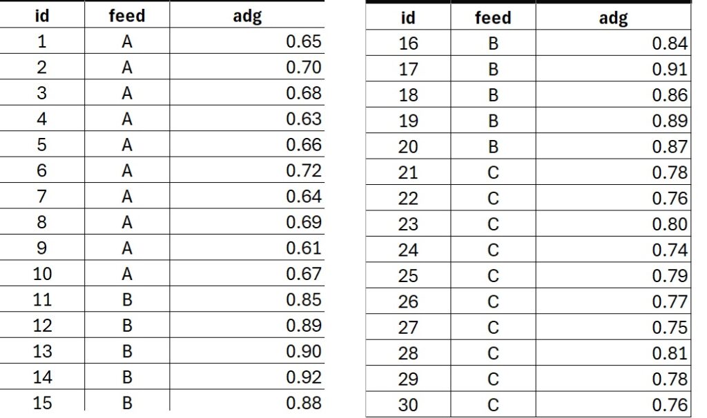 To demonstrate how to perform a one-way ANOVA, I will use a non-laboratory research case study. A researcher wants to examine whether there are differences in the average daily weight gain of beef cattle after being fed three different types of feed.