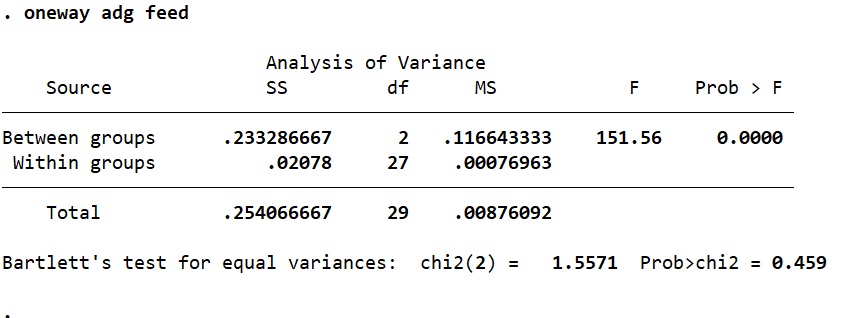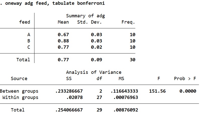From the output, it can be seen that there are significant differences between Feed A, Feed B, and Feed C, as indicated by the p-value < 0.05. Since the one-way ANOVA result shows significant differences, a post-hoc test is necessary.