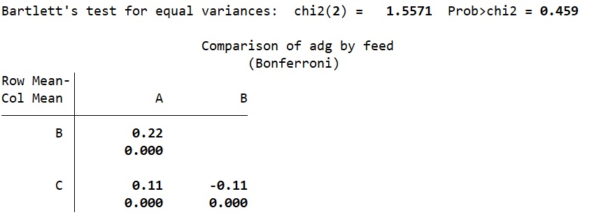 Based on the post-hoc results, it can be concluded that each type of feed shows significant differences. This includes differences between Feed A and Feed B, Feed A and Feed C, as well as Feed B and Feed C.